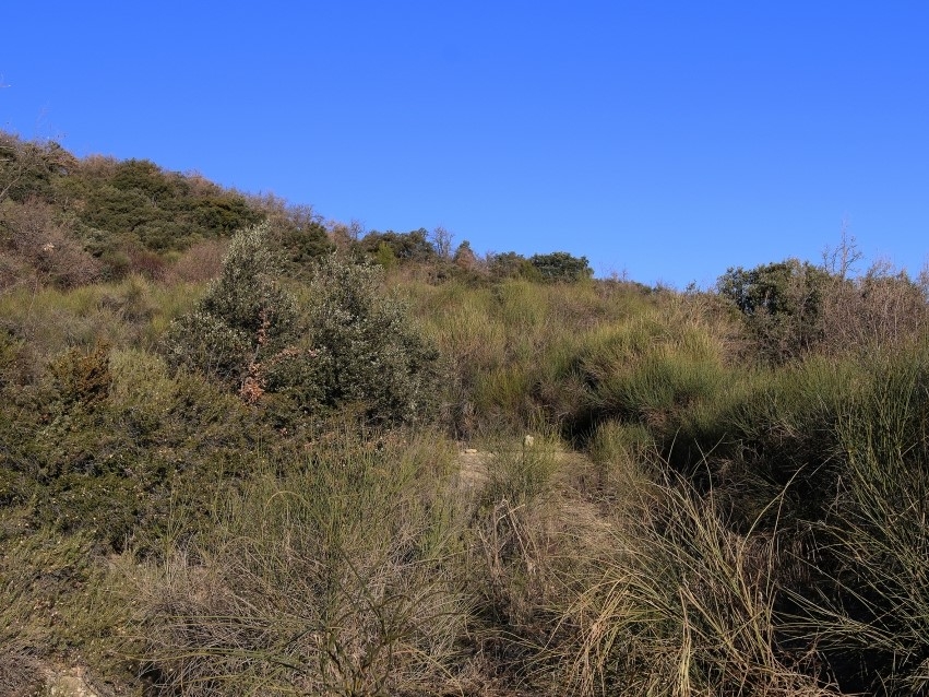 Predomina el bosc de roure de fulla petita (Quercus faginea), amb trams de carrasca (Quercus ilex subs. ballota) sobre un substrat calcari, força rocallós en alguns sectors, on es troba boix (Buxus semprevirens), càdec (Juniperus oxycedrus) i argelaga (Genista scorpius). El recorregut transcorre per un camí poc transitat i força costerut, a excepció de la secció 3, que discorre en paral·lel a la carretera, un replà amb herbassar que és l'única part del tram que és plana. D'aquesta secció 3 destaca pel què fa a la flora la presència d'espècies com la botja (Dorycnium pentaphyllum), el Lolium sp. (possibement sp. rigidum), Rubus ulmifolius, entre d'altres.