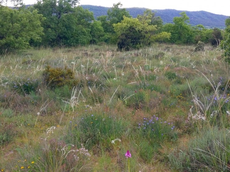 El recorregut transcorre principalment per una àrea dominada per un mosaic força ben conservat de prats naturals submediterranis i mediterranis de diversa mena. En els sòls més profunds hi trobem joncedes i fenassars, mentre que en els sòls més prims s'hi estableixen timonedes i prats rics en espècies anuals, entre els que destaquen els dominats pels pelagots (Stipa iberica, S. capillata), molt típics de l'altiplà del Moianès i d’elevat interès per a la conservació.