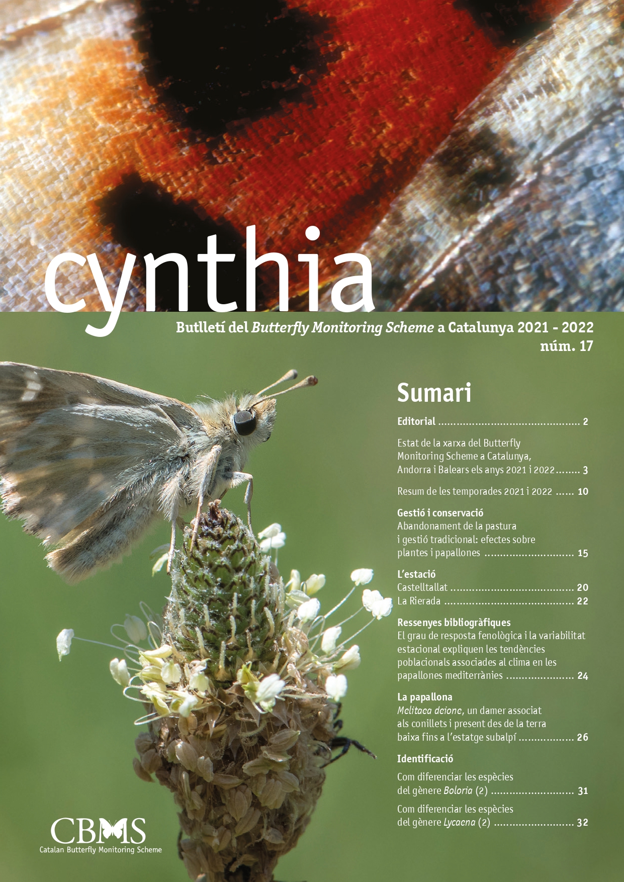 Cynthia is a biennial publication that offers a summary of the most interesting data from each counting season. It also includes a series of sections describing different sampling stations, the scientific work generated by the project, identification sheets for confusing species, and, in general, anything remarkable about the ecology of Catalan butterflies.