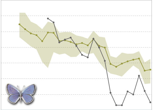Glaucopsyche melanops is undergoing a severe decline in Catalonia. This negative trend is well reflected in the data from La Conreria, where the population has declined greatly over the past two decades and the species is no longer one of the commonest butterflies as it was in the 1990s. The main reason for this local fall has been habitat encroachment, which has also led to a decline in the main host plants.