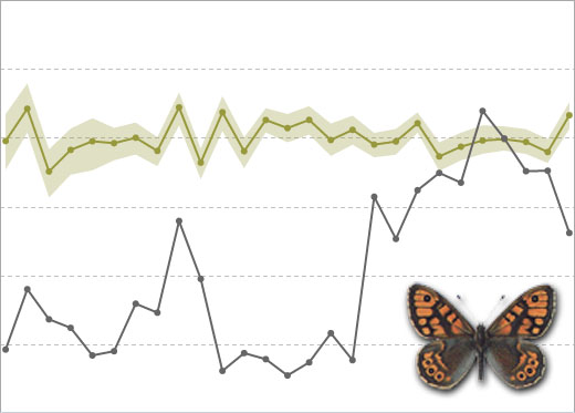 Although Lasiommata megera is undergoing a severe decline in central Europe, its trend in Catalonia is stable. At local scale, however, some notable increases have been recorded in the last decades. For instance, in El Cortalet, in Aiguamolls de l’Empordà Natural Park, its population levels are higher today than at the start of monitoring in 1994.
