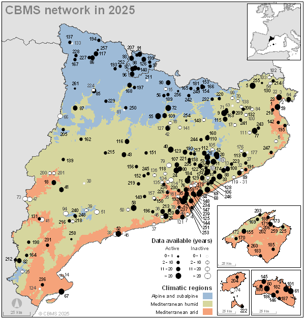 Although the first transect at El Cortalet (in the Aiguamolls de l'Empordà Natural Park) was established in 1988, the Catalan BMS network as such began to operate in 1994, when 10 more transects were added. Since then, the number of transects has been increasing steadily. As of 2025, data has been collected from 261 itineraries, 175 of which were active in that year.